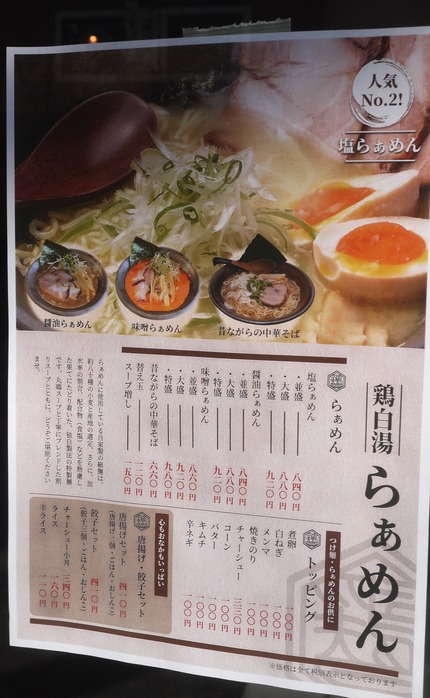 らぁめんもつけ麺と同様のスープに独自製法の自家製細麺を使用。こちらも塩・味噌・醤油の各種らぁめんを並盛、大盛り、特盛で味わうことができます。