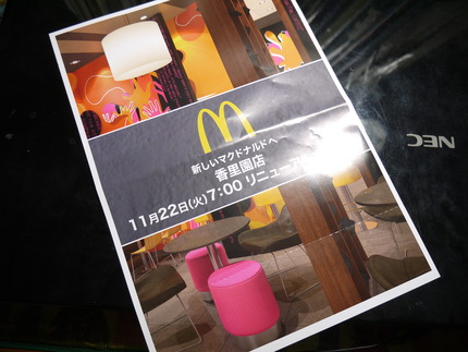 ファストフード店のマクドナルド香里園店がリニューアルオープンしていました。