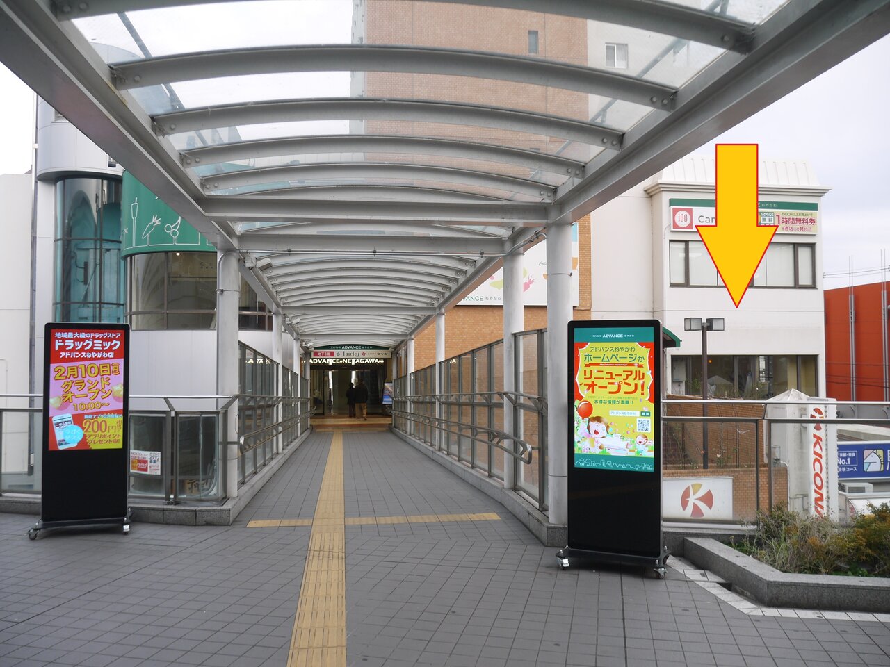 ATMコーナーが設置される場所は、寝屋川市駅南改札口からデッキを渡り、アドバンスねやがわ2号館の2階入口まで来たところ(入口の右手。先日オープンしたミック健康の森ACTiVEの隣)です。