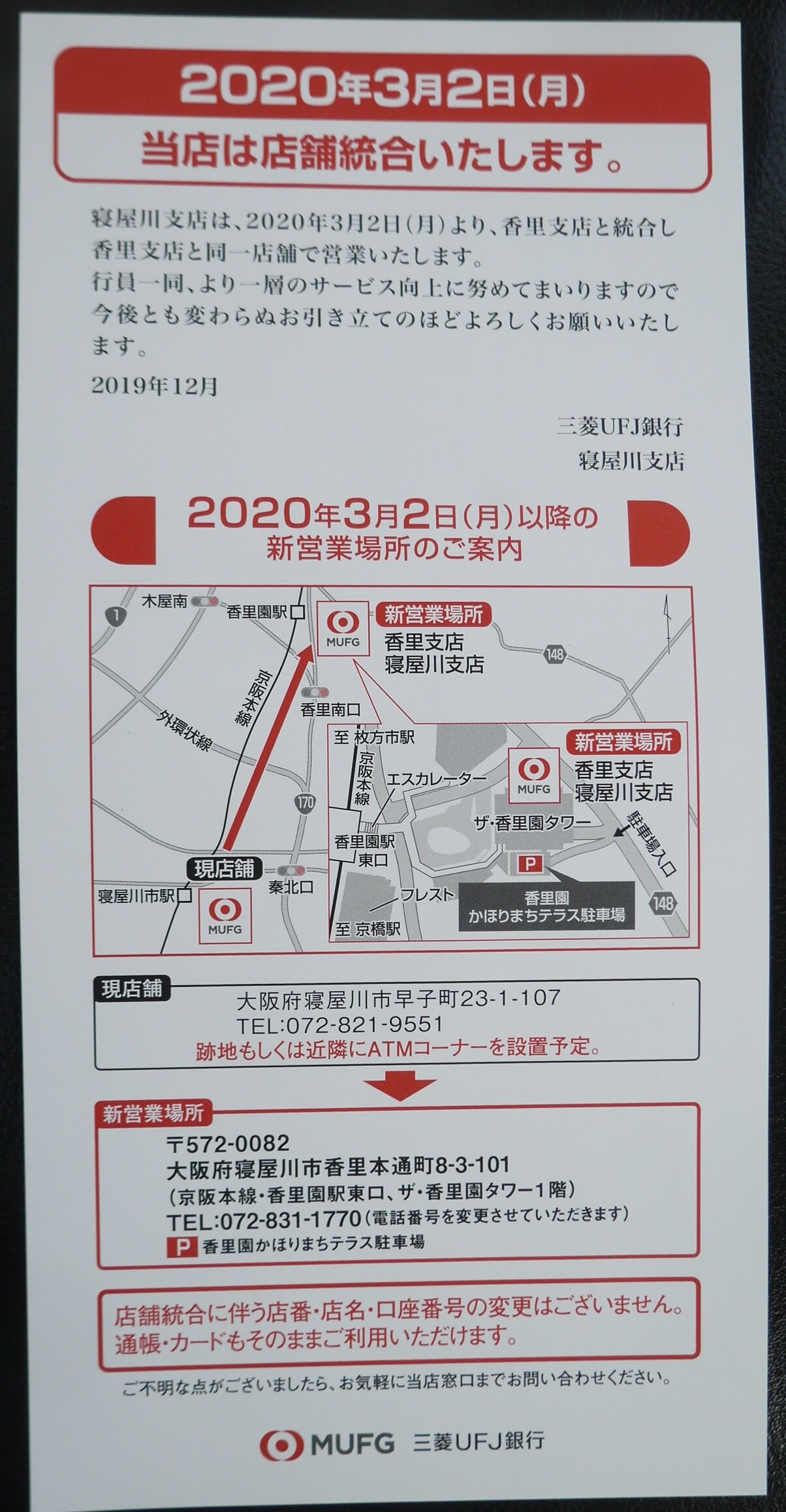 ・三菱UFJ銀行寝屋川支店が香里支店との統合を発表(2019年12月)