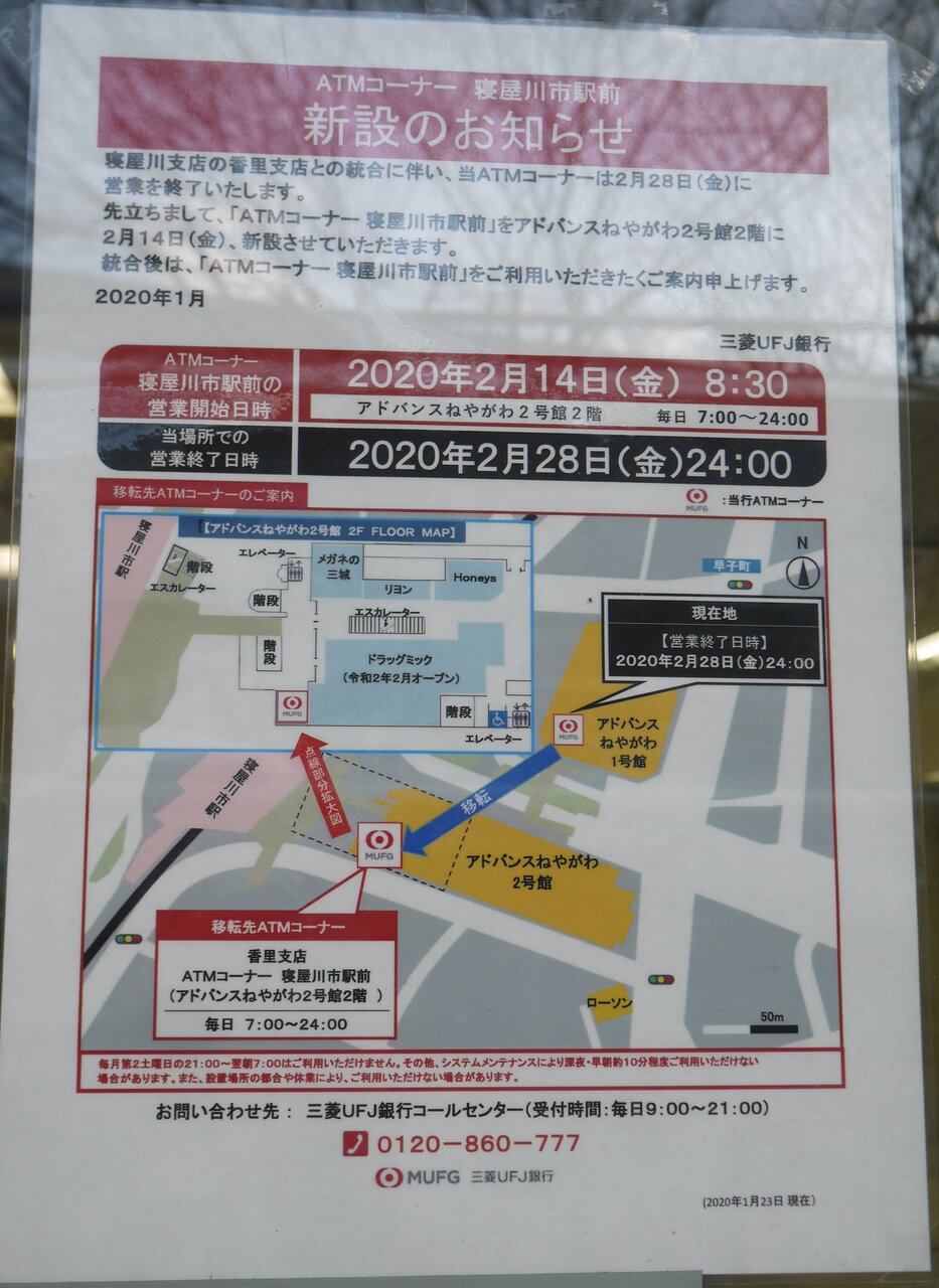 三菱UFJ銀行寝屋川支店(アドバンスねやがわ1号館1階)が2月28日(金)をもって京阪寝屋川市駅前での営業を終了しました。