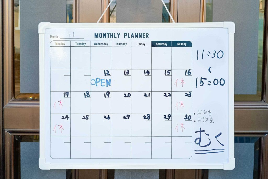 営業時間は11:30から15:00。定休日は日曜・月曜とのこと。お店のSNSなどはまだないみたいなので、店頭のカレンダーで確認するとよさそう。
