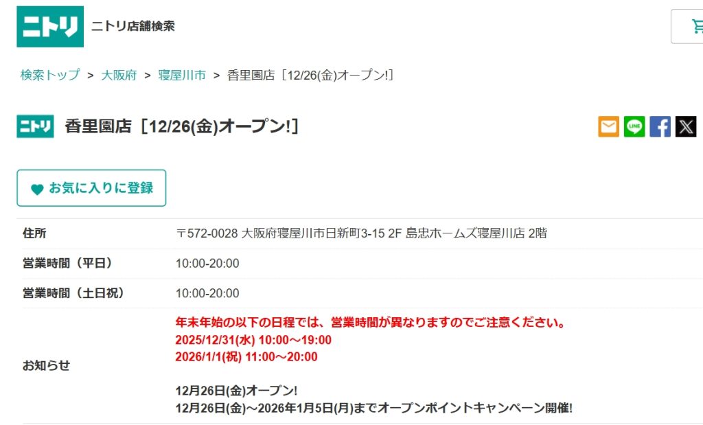 ホームズ寝屋川に作っていた「ニトリ 香里園店」がオープンしています。