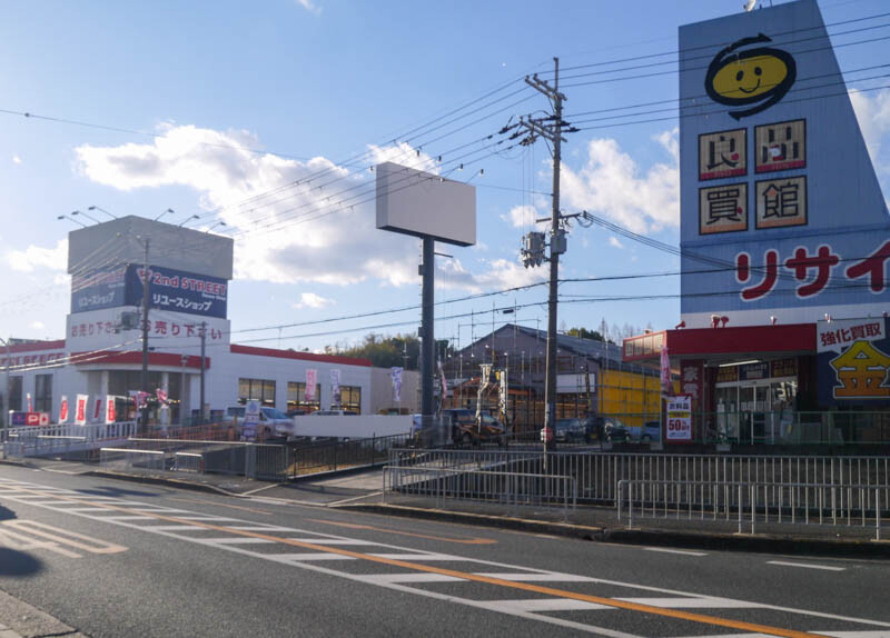 リサイクルショップのセカンドストリート(左隣)と良品買館(右隣)に挟まれた立地です。