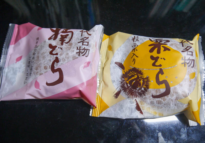 左の「楠どら」(税抜き140円)が普通のどら焼きで、右の「栗どら」(税抜き180円)が粒栗入りです。(輸送中に形がつぶれてしまっています。汗)