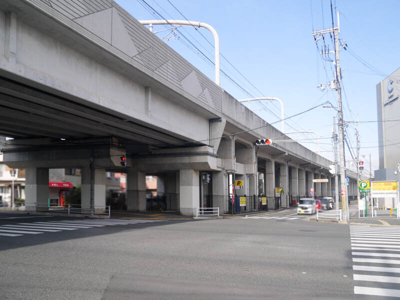 交差点の両側の高架下が駐車場として利用されているわけですが、「オープン」の旗が設置された状態になっています。