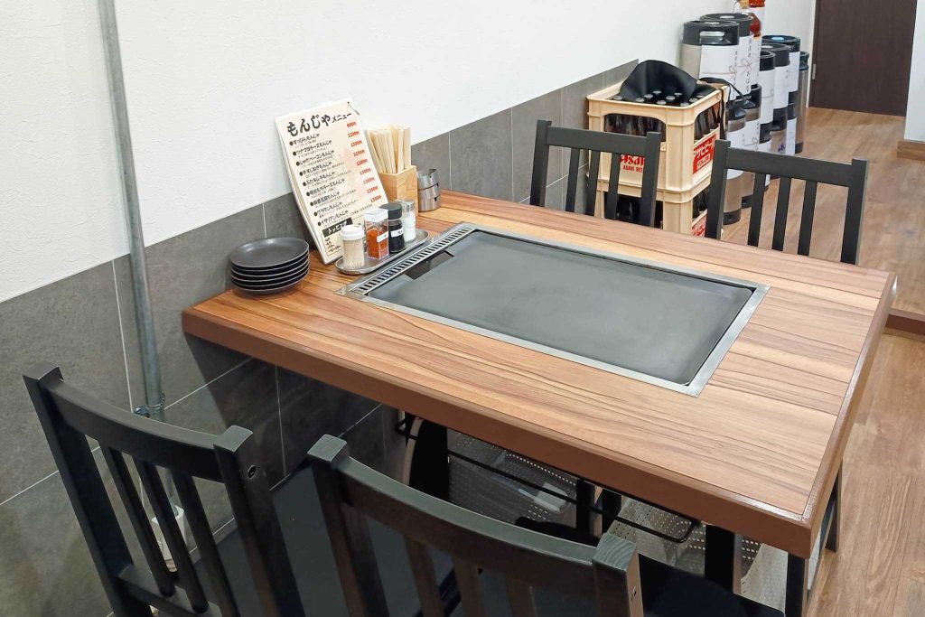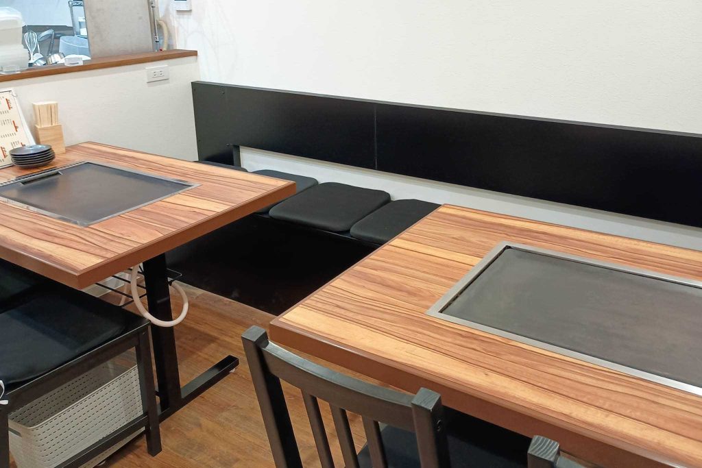 鉄板付きのテーブル席。写っていないのですが、カウンターのお席もありましたよ。