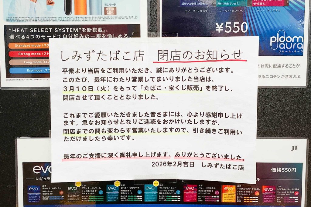 上記によると、3月10日をもって「たばこ・宝くじ販売」が終了とのこと。