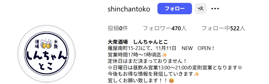 Instagramによると、11月11日にオープン。営業時間は17時から1時ごろまでとのこと。