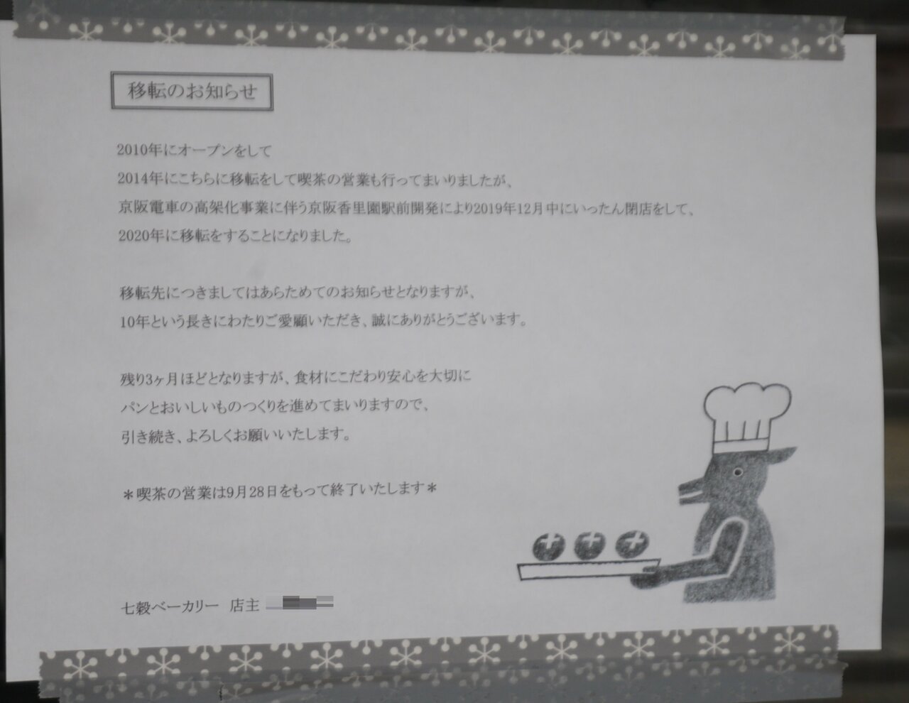 「七穀ベーカリー」は現在、香里南之町の線路沿い(香里園駅から三中方面に南下したところ)にあるお店ですが、