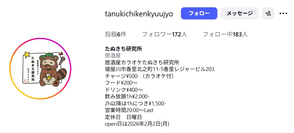 香里園駅ちかくに「たぬきち研究所」ってカラオケ居酒屋ができてる