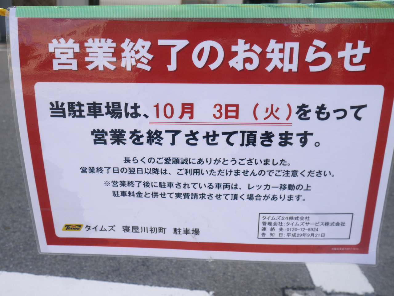 初町のコインパーキング「タイムズ寝屋川初町」が10月3日(火)の営業をもって閉鎖されています。
