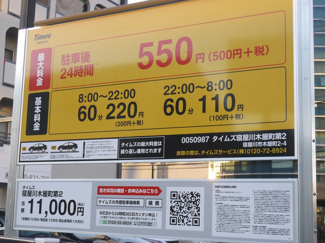 駐車台数は10台ほど。気になる駐車料金は、8~22時が60分220円、22~8時が60分110円(24時間の最大料金は550円)です。