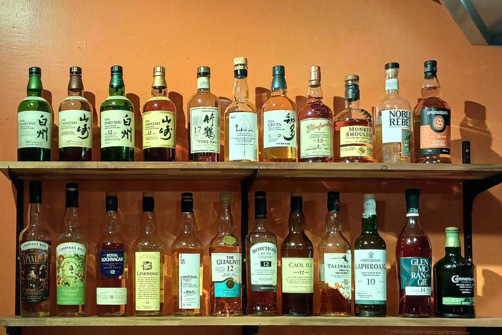 オレンジの壁面に映える、ボトルがずらり!ウイスキー好きな人にはたまらないですね。