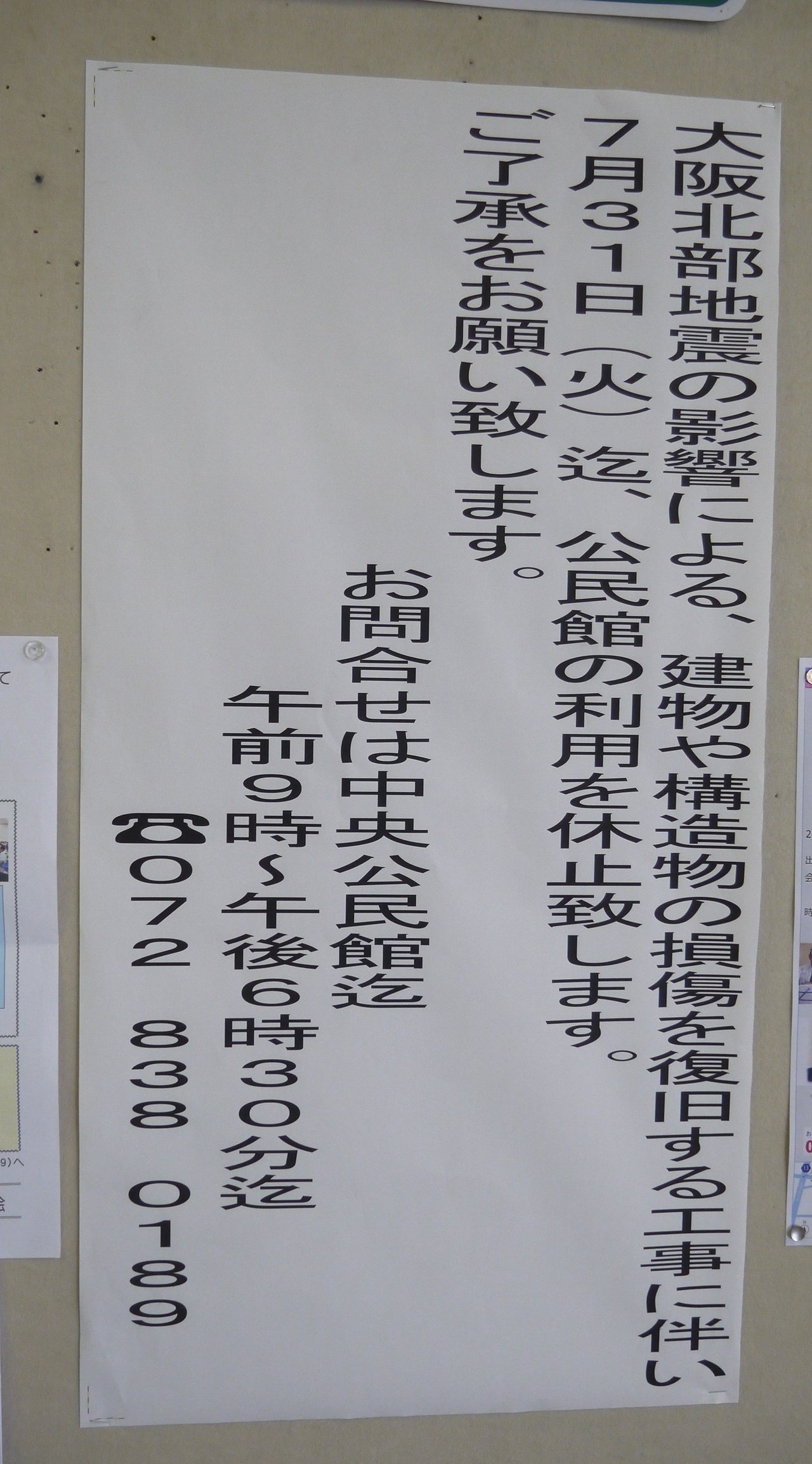 大阪府北部地震(寝屋川市は震度5強)の影響により休館している中央公民館と中央図書館(池田西町の市立総合センター内)の再開時期が、延期されたみたいです。