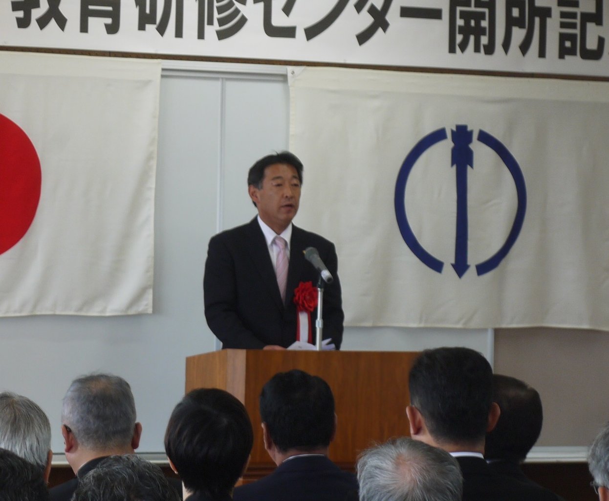 はじめに北川法夫市長が挨拶します。4月から中核市へと移行することにより、市が一貫して全ての教職員の研修を行うようになることや、3つの柱(後述)を主な業務としていることなどをアピール。