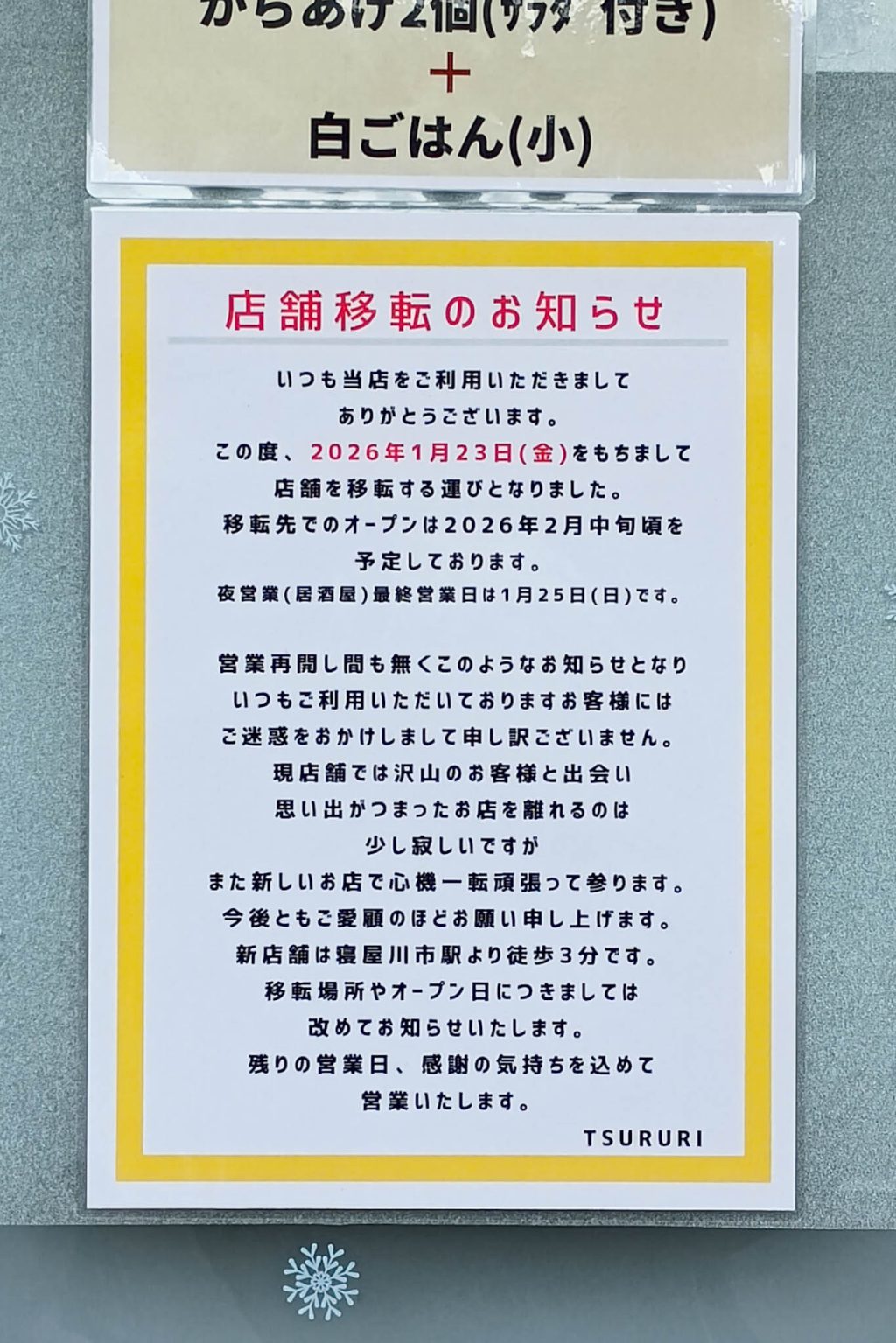 上記によると、1月23日をもって店舗を移転。移転先でのオープンは2月中旬頃の予定とのこと。夜営業(居酒屋)最終営業日は1月25日なんだそうです。