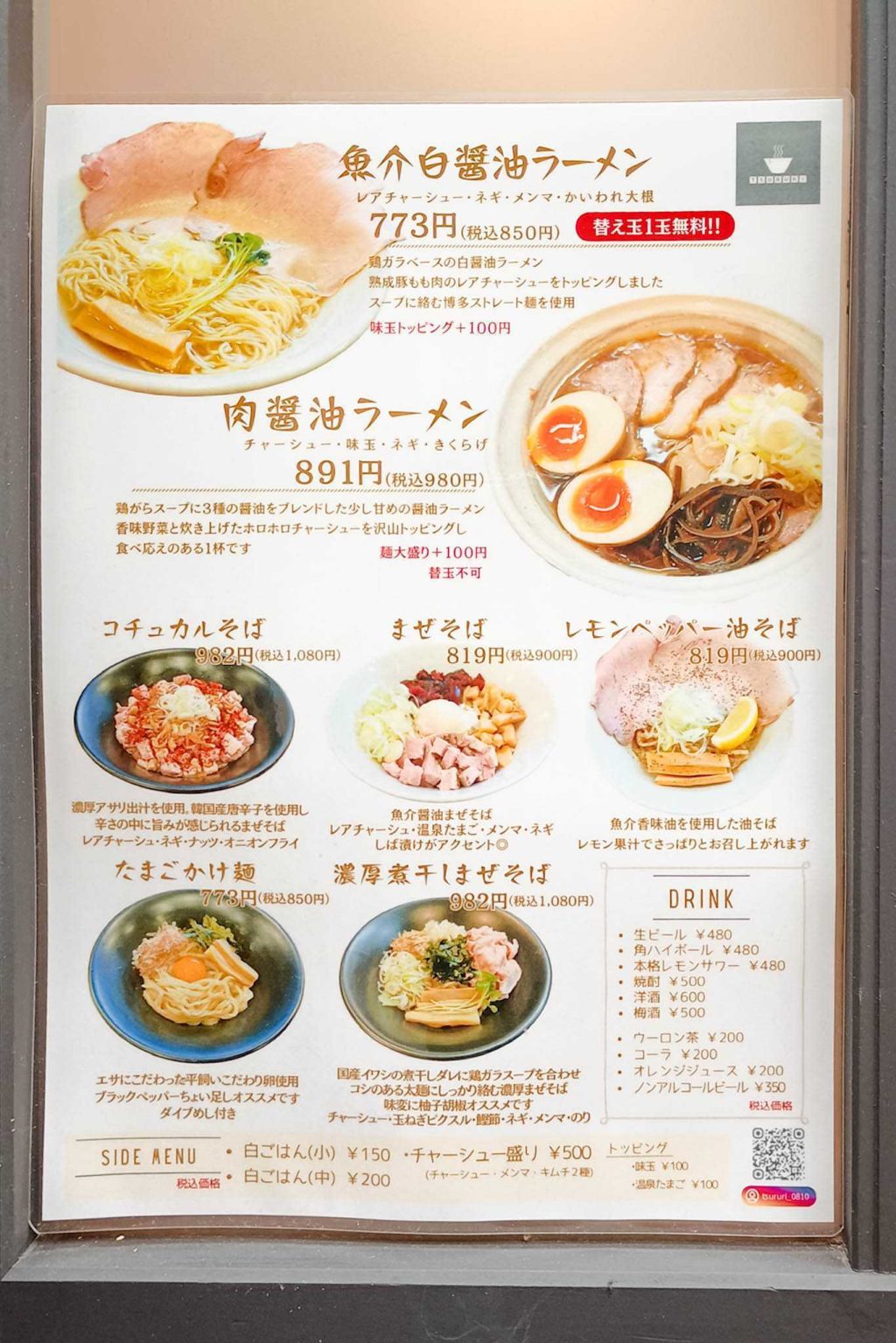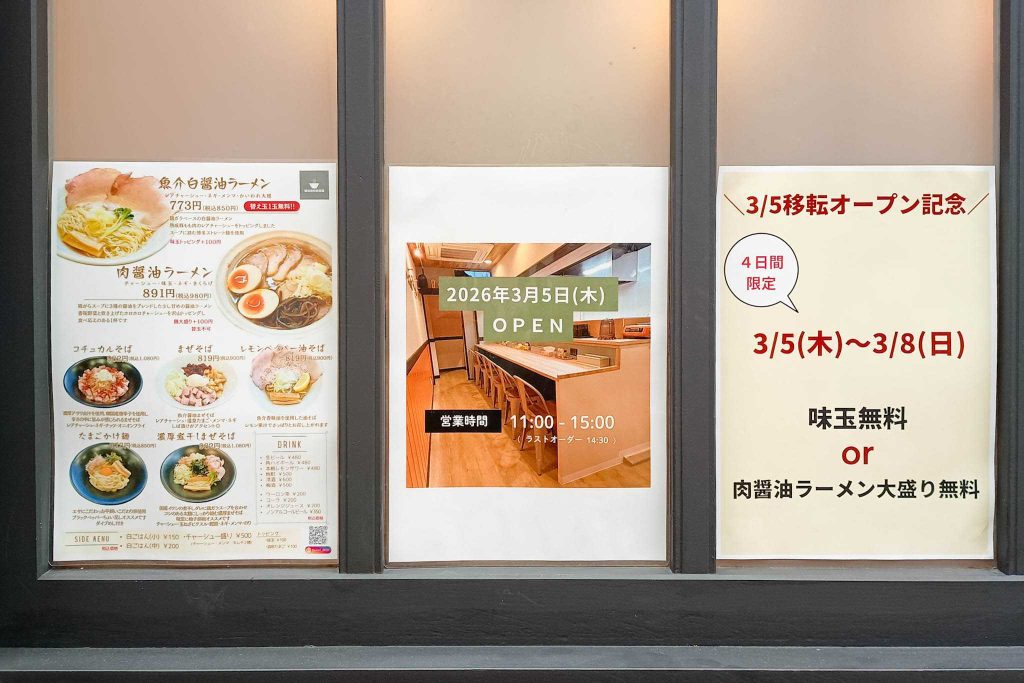 3月5日に移転オープン。8日まで移転オープン記念で味玉無料or肉醤油ラーメン大盛り無料なんだとか!