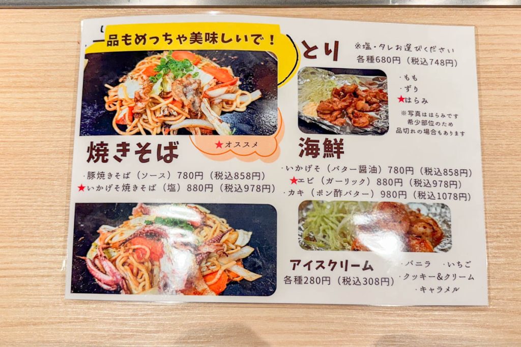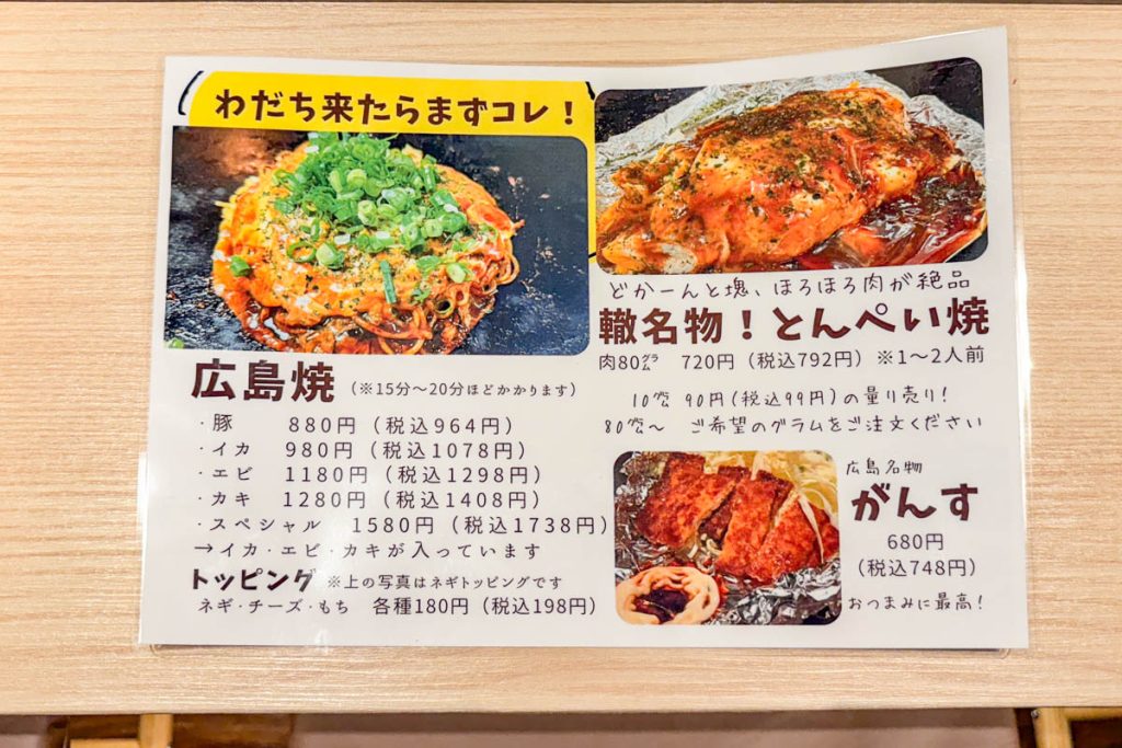 広島焼き、焼きそば、とんぺい焼きのほか鉄板焼や一品メニューもいろいろあります。