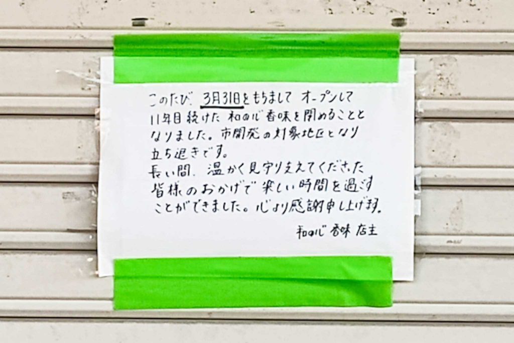 上記によると3月31日に閉店。市開発の対象地区となり立ち退きなんだそうです。