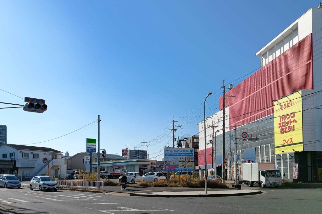 ファミリーマートなどがある交差点近くのパチンコ店です。