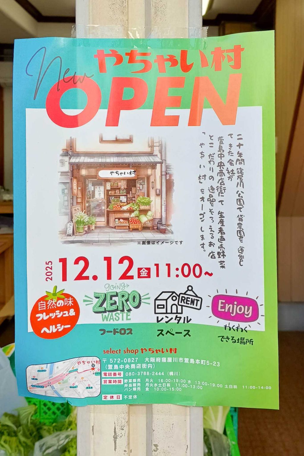 萱島中央商店街に「やちゃい村」という生産者直売野菜とこだわり食材のお店ができています。