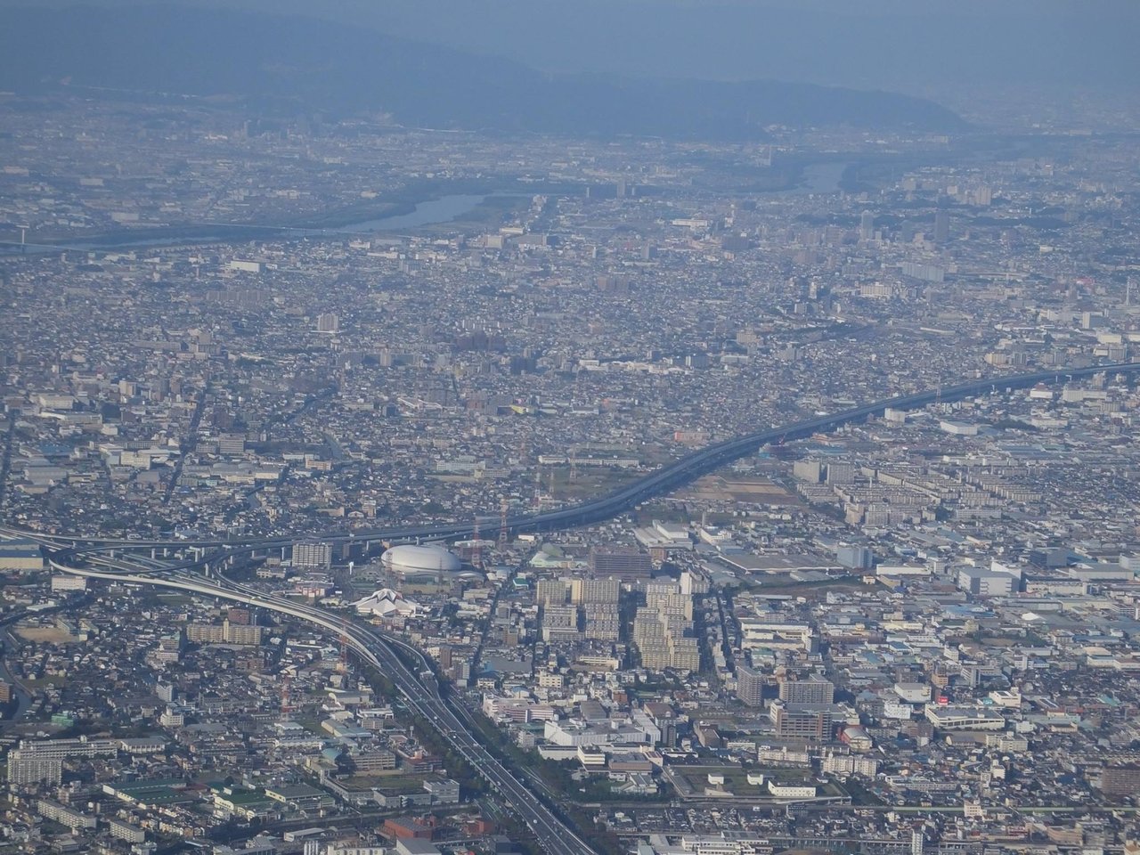 大阪平野上空からは近畿自動車道や第二京阪道路、門真のなみはやドームが見てとれます。