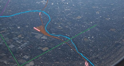 京阪電鉄寝屋川車両基地や中木田中学校のグラウンドがくっきりと写っていますね。6月にご紹介した航空写真では枚方の天野川上空付近を通過していましたが、今回の方が寝屋川市の真上を飛ぶ飛行コースのようです。