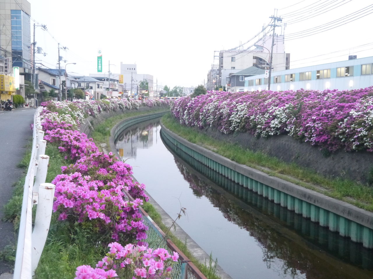 寝屋川市内を南北に流れる寝屋川の両岸に、きれいなツツジの花が咲いています。