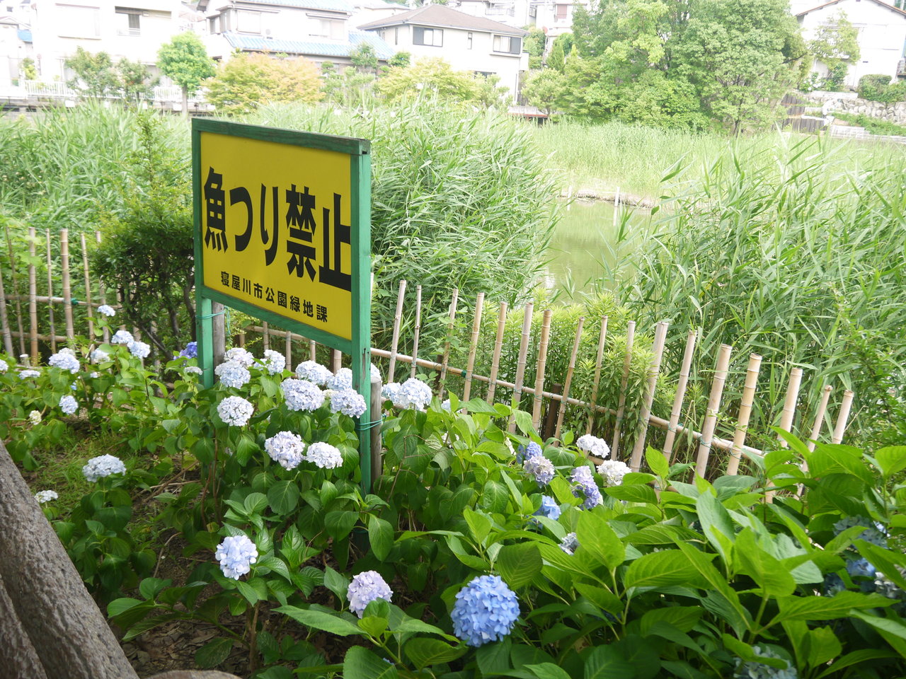 アジサイの花をお伝えするのは、寝屋川公園や打上川治水緑地に続いて今年で3回目になります。池の真横というロケーションは今回が初めてです。