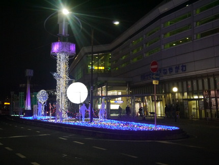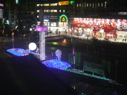 西口バスロータリー(ベル大利商店街へ向かう外島橋の横)の植えこみに青色をメインとした発光ダイオード(LED)が光り輝き、ロマンチックな雰囲気に包まれています!
