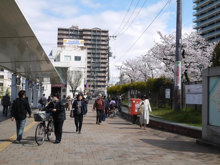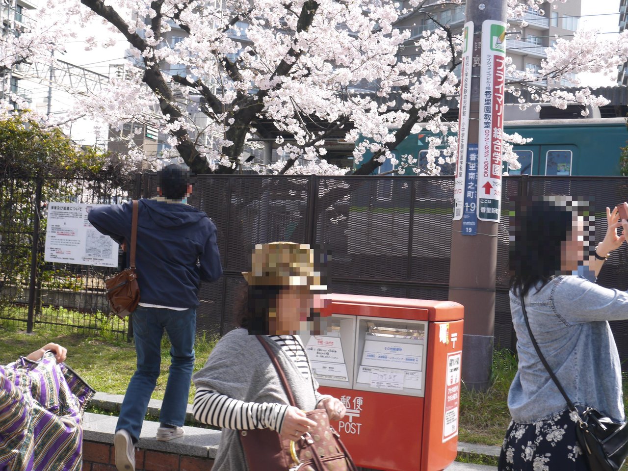 場所は香里園駅西口のバスロータリー前で、線路沿いの桜の木が綺麗な光景になっています。