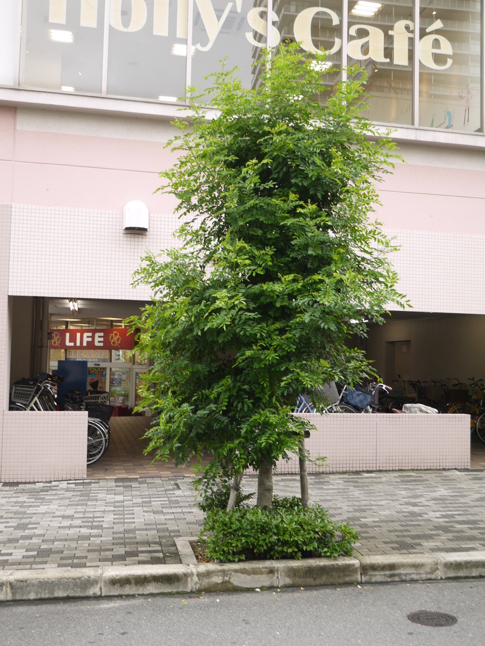 ファミリーマート側(京阪の線路側)の方に植えられている街路樹は、また別の品種のようです。そういった意味でも、左側の街路樹は可愛らしいというか独特な雰囲気ですね。