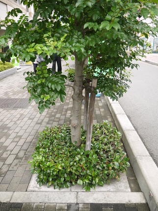 めっちゃ下の幹の方まで葉っぱが生えている&地面にも似たような葉っぱをつけた植物が植えられています。