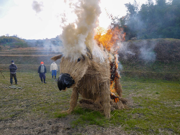 新年の干支をモチーフにした「干支とんど」は地元の高倉水利組合(公式Facebook)が2010年から制作しているもので、小正月の時期(1月中旬)にお正月のしめ飾りなどと一緒に燃やすのが「高倉とんど焼き」です。