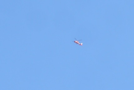 6月のとある日に仁和寺交差点付近で上空を見上げると、紅白に塗られたヘリコプターが飛んでいるのを発見しました。