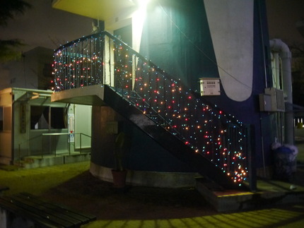 このイルミネーションは、給水塔(昼間の様子はコチラ)の上部から北側の立体駐車場に向けて張られているのが特徴で、団地の中にある路地を跨ぐような形になっています。