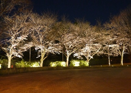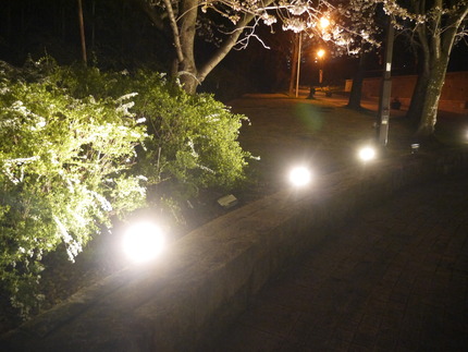 寝屋川公園駅側の入口と時計塔の中間にあるソメイヨシノ約5本を照らす小規模な試みですが、幻想的な夜桜を楽しめるようになっています。