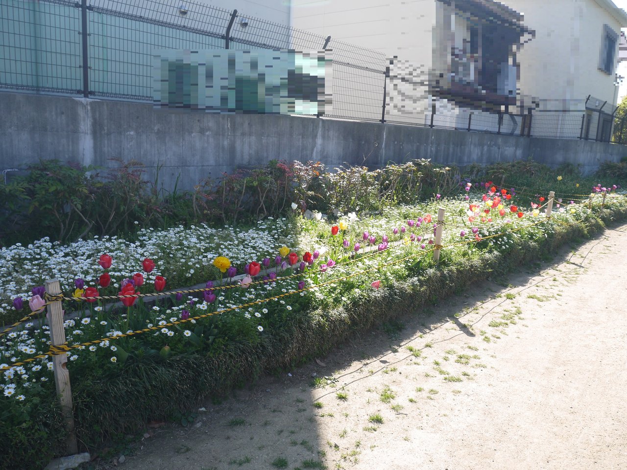 チューリップの花は赤やピンク、紫色など様々。花壇は公園の南端だけでなく、遊具の近くにもありました。