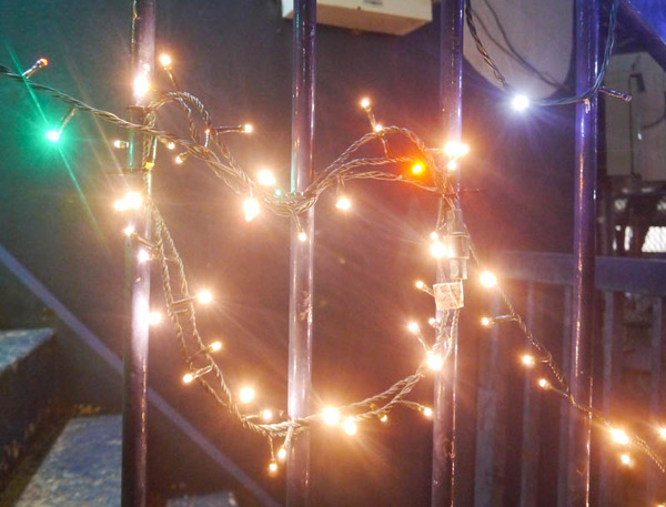 団地内の給水塔(昼間の様子はコチラ)から隣接する立体駐車場に向けてLEDの電飾が13本張られていて、道路から見上げるような形でクリスマスの雰囲気を楽しめる仕掛けです。