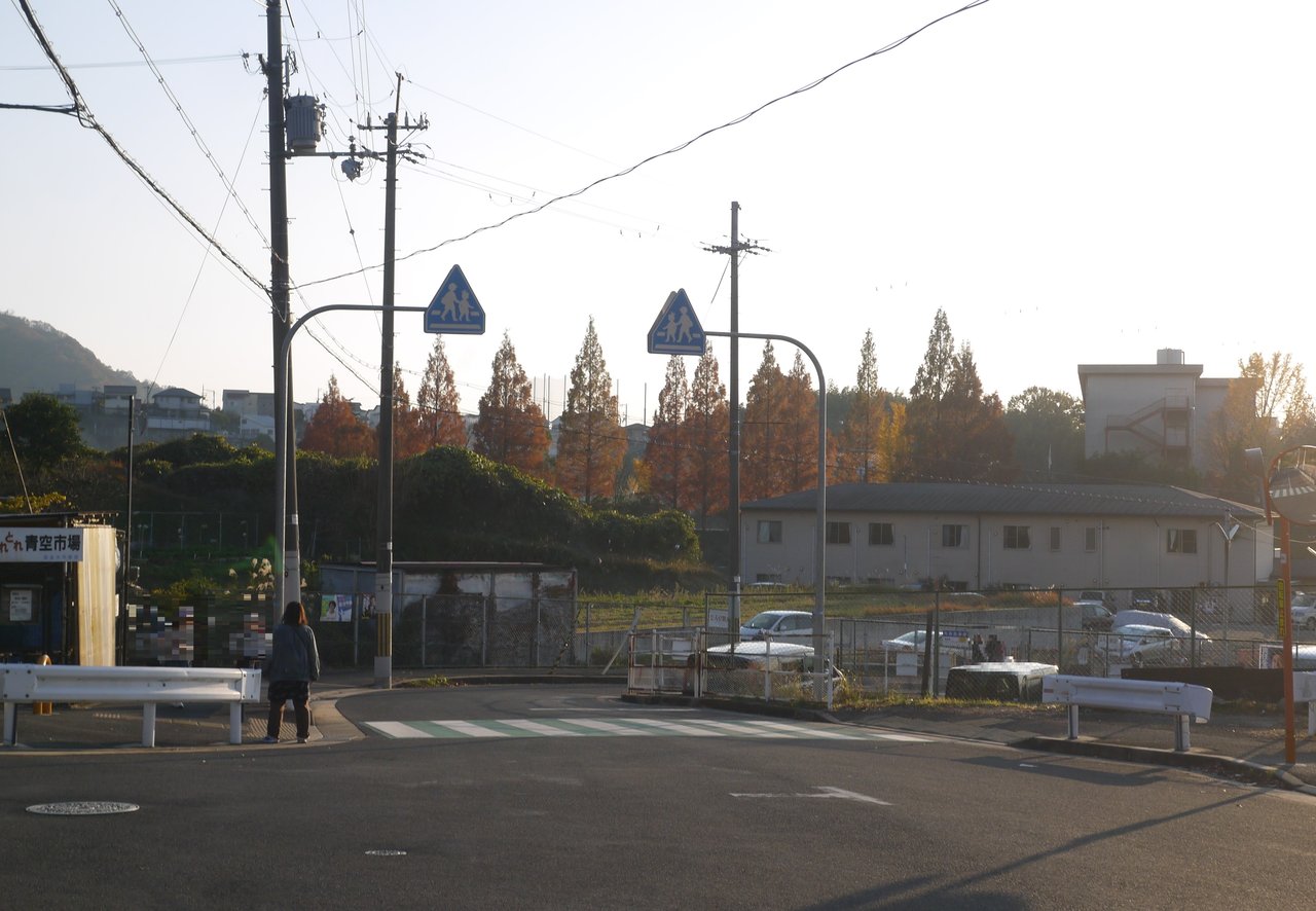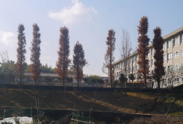 寝屋川市立梅が丘小学校(寝屋川公園駅方面)に植えられたメタセコイアの木が、茶色く色づいています。