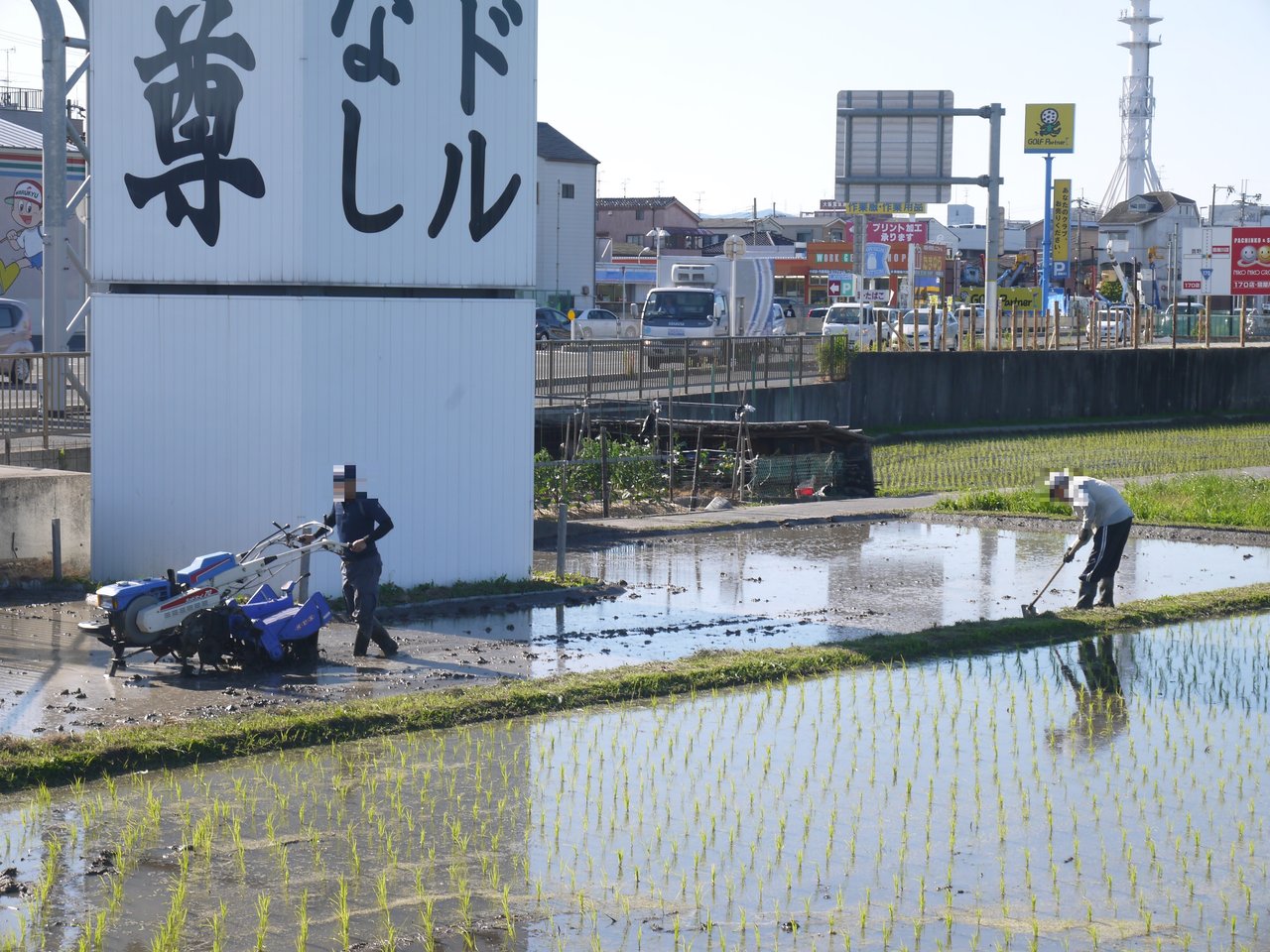 6月4日(日)に高宮1丁目(寝屋川市南部)の国道170号線を通りかかると、田植えの終わった田んぼを見ることができました。