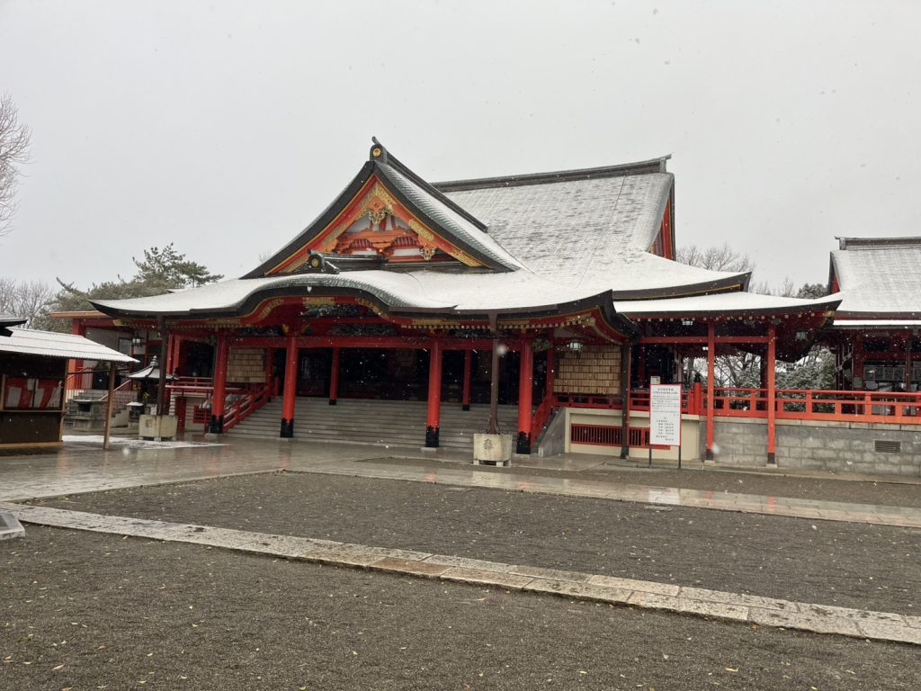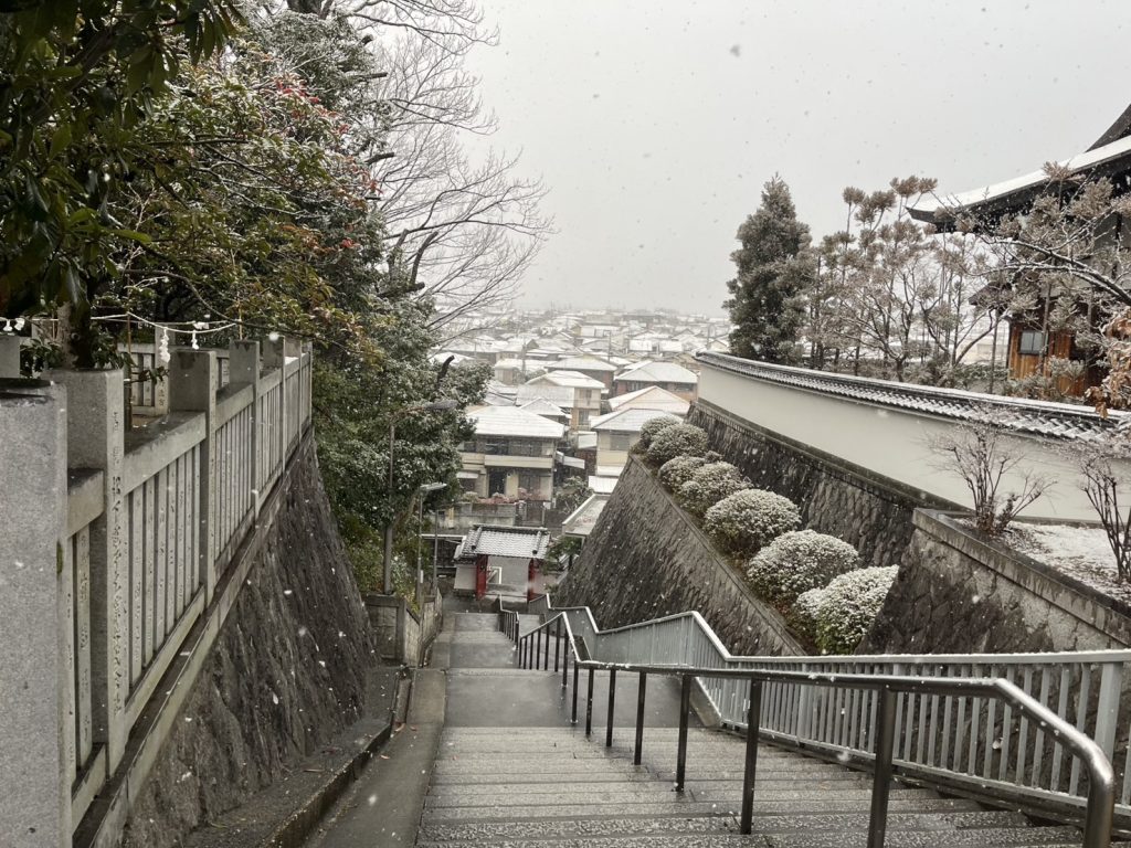 雪で白くなった屋根と朱色の柱が映えてめっちゃ綺麗。寝屋川の街も真っ白~。