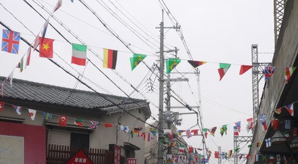 万国旗は電柱や商店街の看板、京阪電車の高架橋に結びつけられていて、中には民家やコンビニの看板の支柱に結びつけられている箇所も。