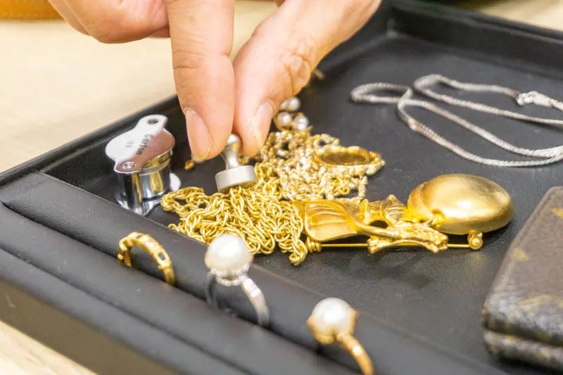 前回もお見せしたように金かどうかは磁石で判断できますし、宝石かどうかはルーペで輝きを見たりして判断していますよ。
