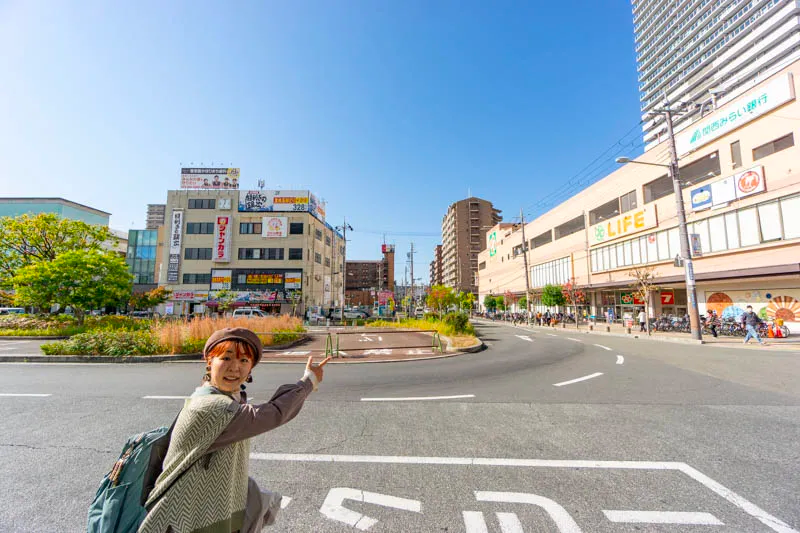 ここから歩いてすぐやで。ほら、あの看板に地図もあるし。