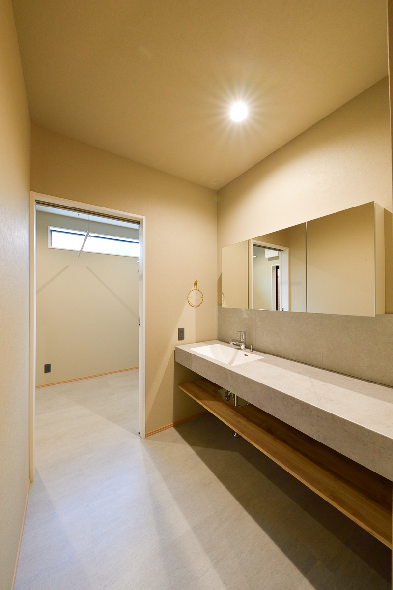 洗面室の奥に脱衣室をつくり、そのままファミリークローゼットへ回遊できるように工夫されています。