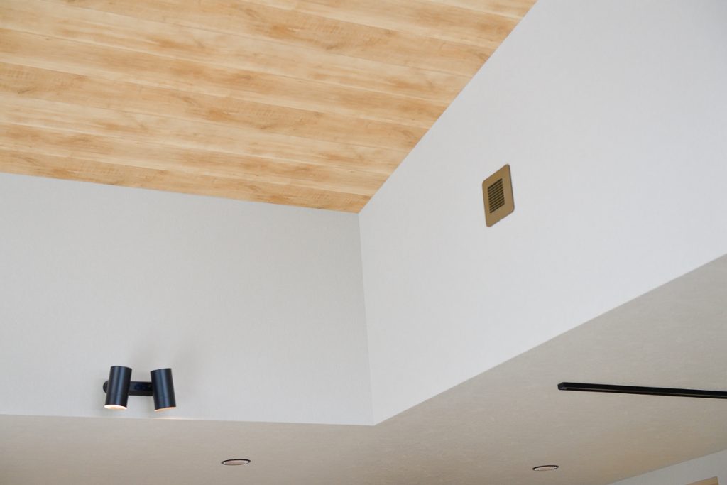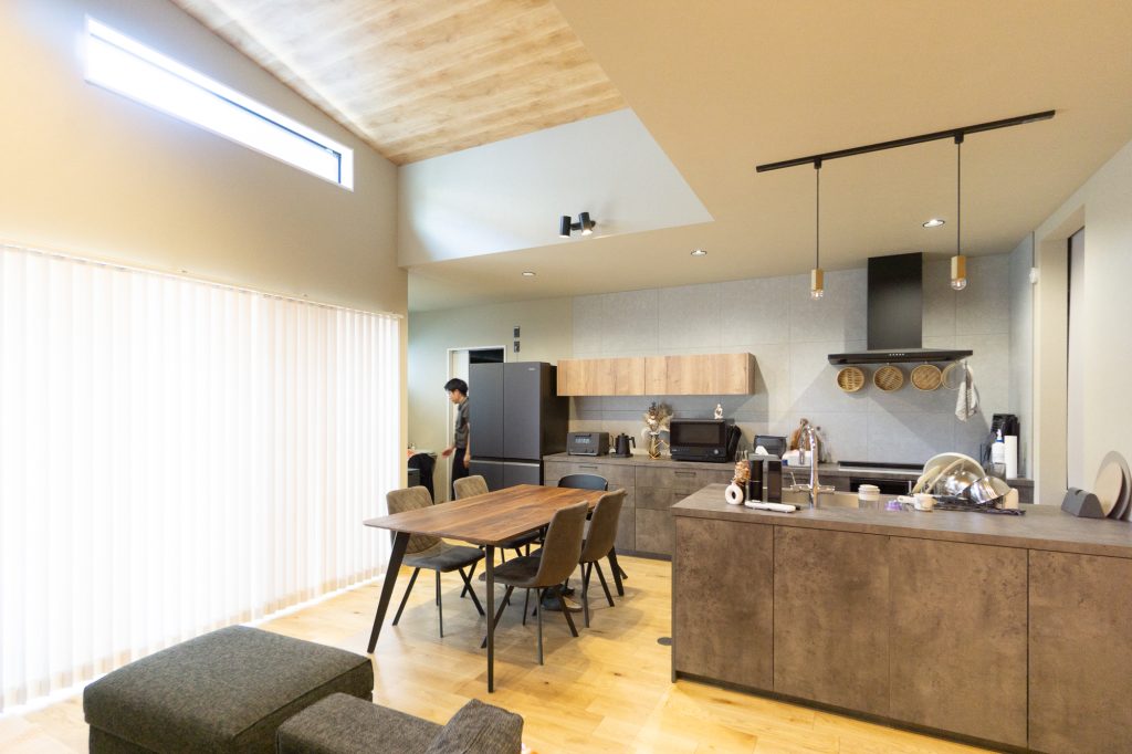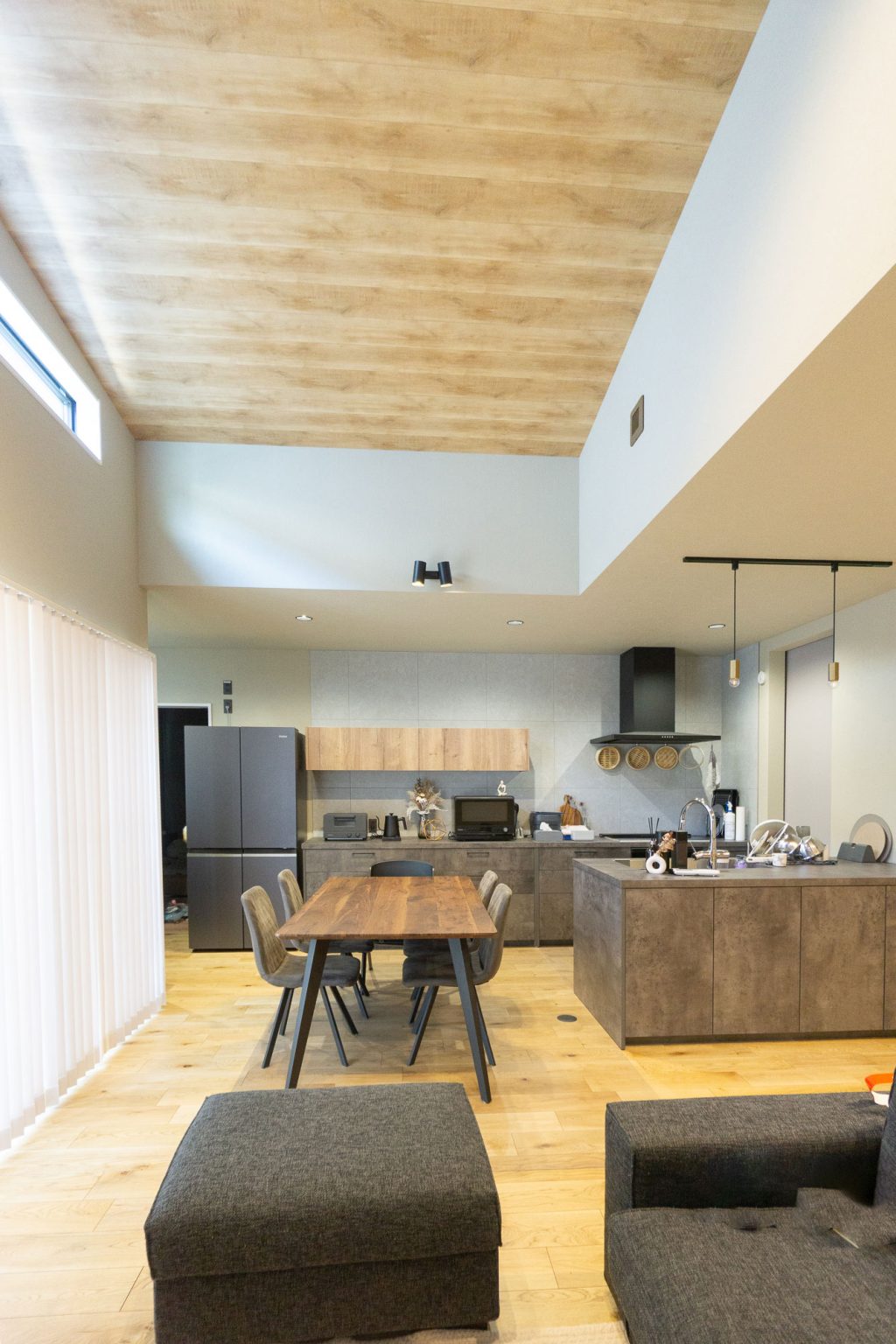 屋根の形に合わせて天井に傾斜がつくことでリビングがより開放的に見えて、この下に寝転がってしみじみ良い家やなあと噛み締めています(笑)
