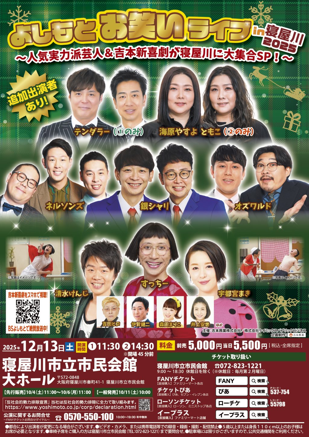 公式サイトによると、12月13日に「よしもとお笑いライブin寝屋川2025」が開催されることがわかります。ライブは11:30〜と14:30〜の2部制です。