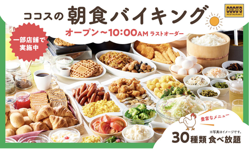 ココスの公式サイトによると一部の店舗で朝食バイキングを実施していまして、こちらのPDFから実施店舗一覧を確認することができます。